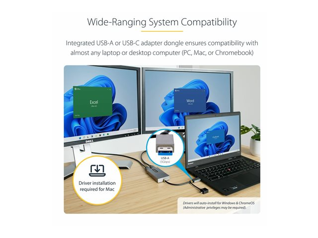107B-USB-HDMI - StarTech.com USB to Dual HDMI Adapter, USB A/C to 2x HDMI Monitors (1x 4K 30Hz, 1x 1080p), Integrated USB-A to C Dongle, 4in/11cm Cable, Windows & macOS