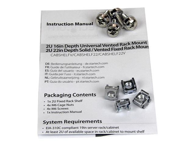 CABSHELF22V - StarTech.com 1U Server Rack Shelf, 2U 22in Universal Fixed Vented Network Rack Shelf/Cantilever Tray for 19" AV/Data/Network Equipment Enclosure w/Cage Nuts & Screws, 50lbs Weight Cap.